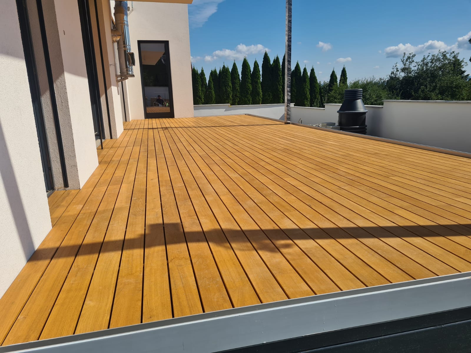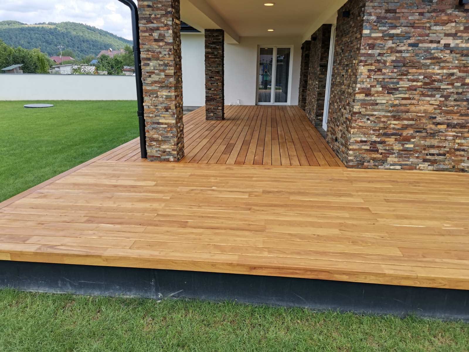 Terasy z akátového dřeva jsou vhodné pro ploché střechy domů, balkony, okolí bazénů, schůdky, můstky a jiné. Terasové desky jsou vyrobeny vykrácením vad a následně jsou délkově napojovány extrémním polyuretanovým lepidlem, které se používá pro nosné konstrukce. Lepidlo nepodléhá povětrnostním vlivům v exteriéru. Firma garantuje pevnost a kvalitu spoje certifikátem pevnosti. Technologií délkového napojování je zajištěna tvarová stálost našich teras, což nelze říci o deskách z exotických dřevin.
